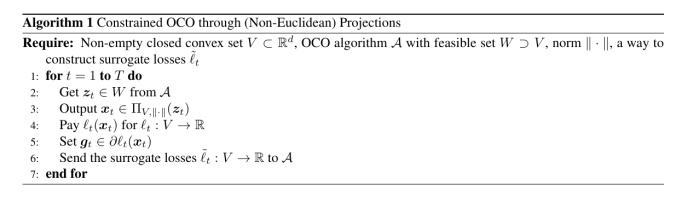 to be convex and closed. Consider Algorithm 1, where we use the Bregman projection and the surrogate losses