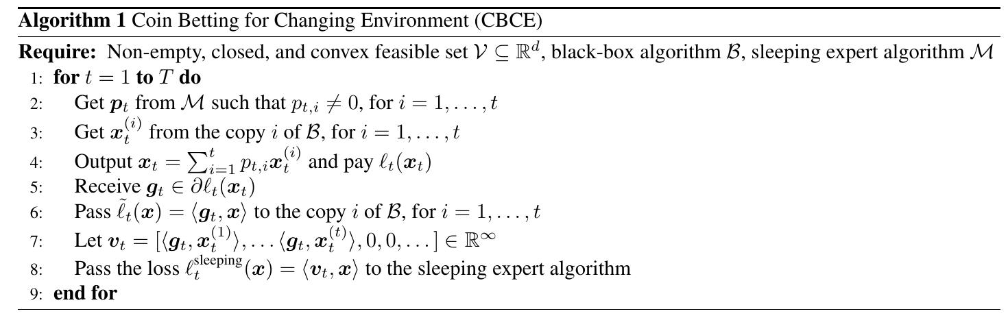 We will introduce now the Coin Betting for Changing Environment (CBCE) algorithm, see Algorithm 1. We use different OCO algorithms, each one starting at a different time step, and we combine them with a sleeping-experts algorithm over a countably infinite number of experts. In particular,