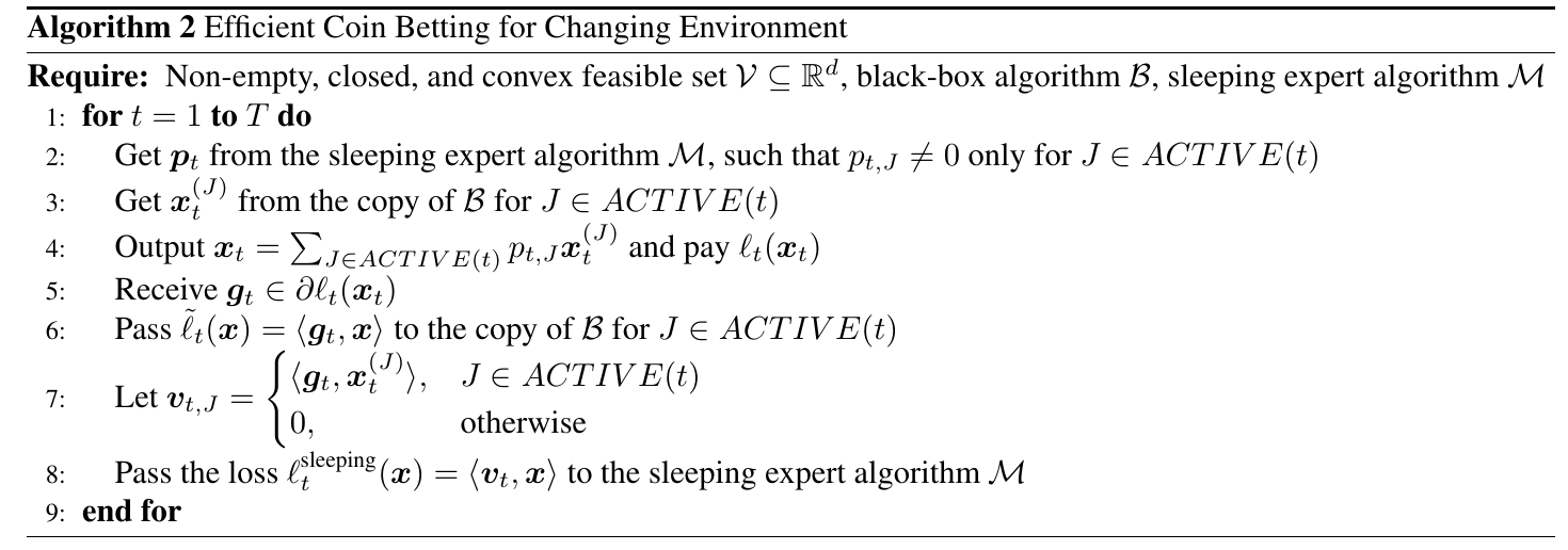 The adaptive regret is defined in Hazan&Seshadhri (2007), Hazan&Seshadhri (2009). The strongly-adaptive regret was defined by Adamskiy et al. (2012), Adamskiy et al. (2016) (still calling it “adaptive regret”) and then reinvented in Daniely et al. (2015) (that coined the name). Note that the strongly-adaptive regret is usually defined for bounded domains, taking the maximum with respect , instead I defined it more generally for any competitor in the feasible set. Lemma 2 is from Daniely et al. (2015) as well. The efficient version of the CBCE algorithm was proposed by Jun et al. (2017), Jun et al. (2017) using a stronger version of the sleeping expert algorithm, still based on coin betting. I simplified the sleeping expert algorithm for didactical reasons. CBCE improves over the guarantee in Daniely et al. (2015) by improving the logarithmic term. The ideas of using linearized losses in CBCE to avoid querying more than one subgradients and the better behaviour of the first term in the bound when